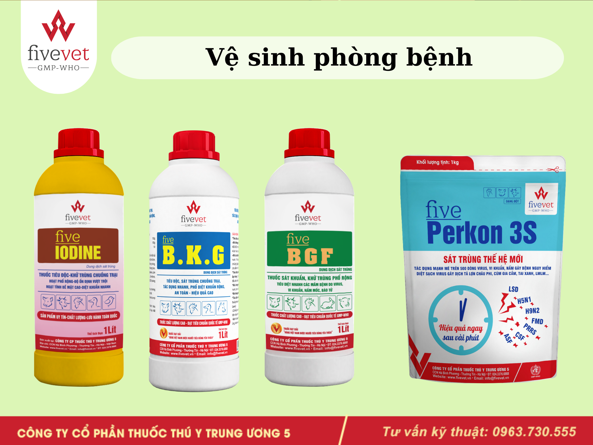 Five-Iodine, Five-BGF, Five-B.K.G, Five-Perkon 3S,… giúp tiêu diệt mầm bệnh hiệu quả.