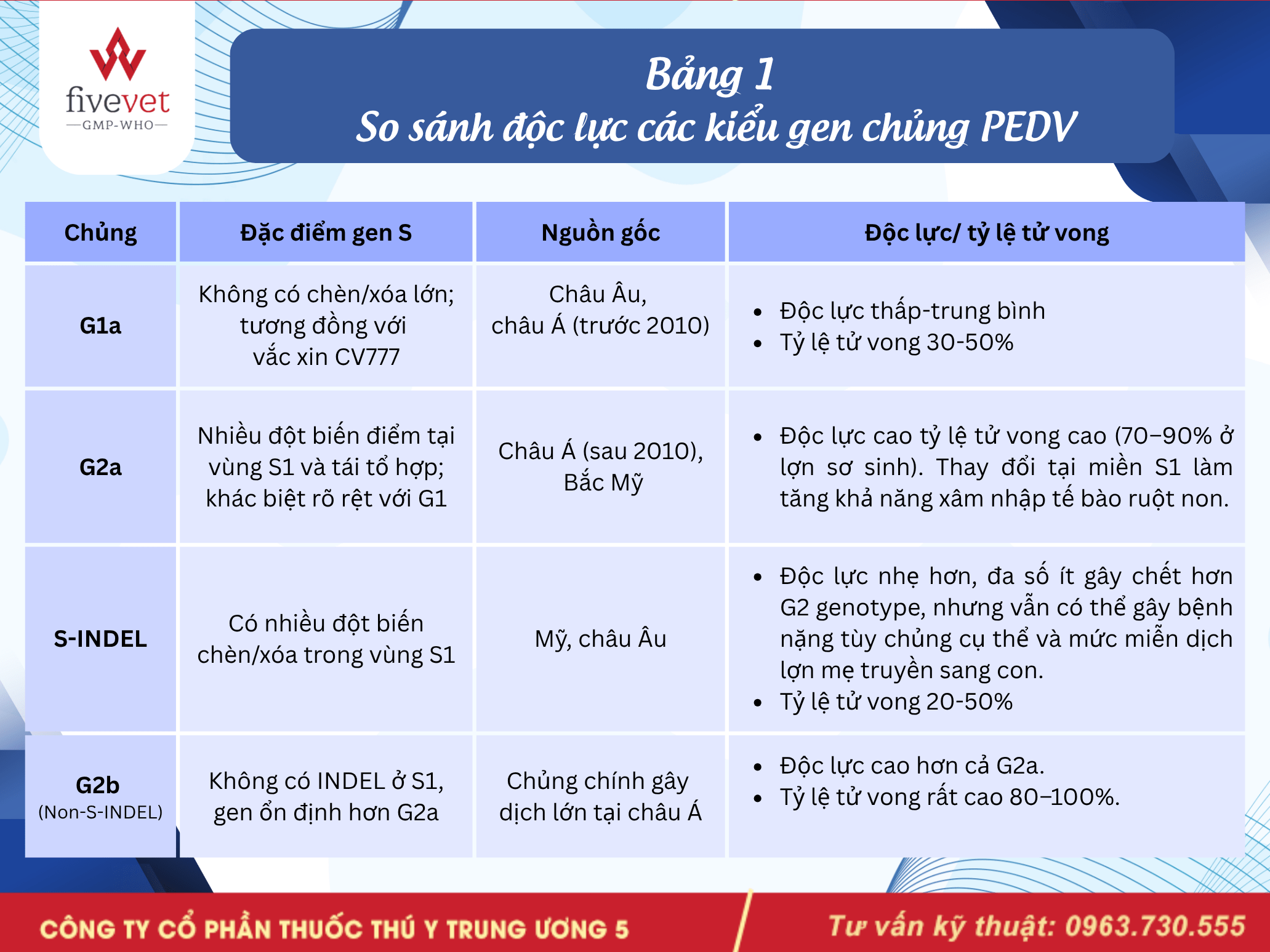 PEDV về di truyền và độc lực. Nhóm G1 gắn liền với các vắc xin cổ điển, tuy nhiên sự xuất hiện và lưu hành chủ yếu của G2 trong thập kỷ qua đã làm giảm hiệu quả bảo hộ của các vắc xin này. Mặc dù,