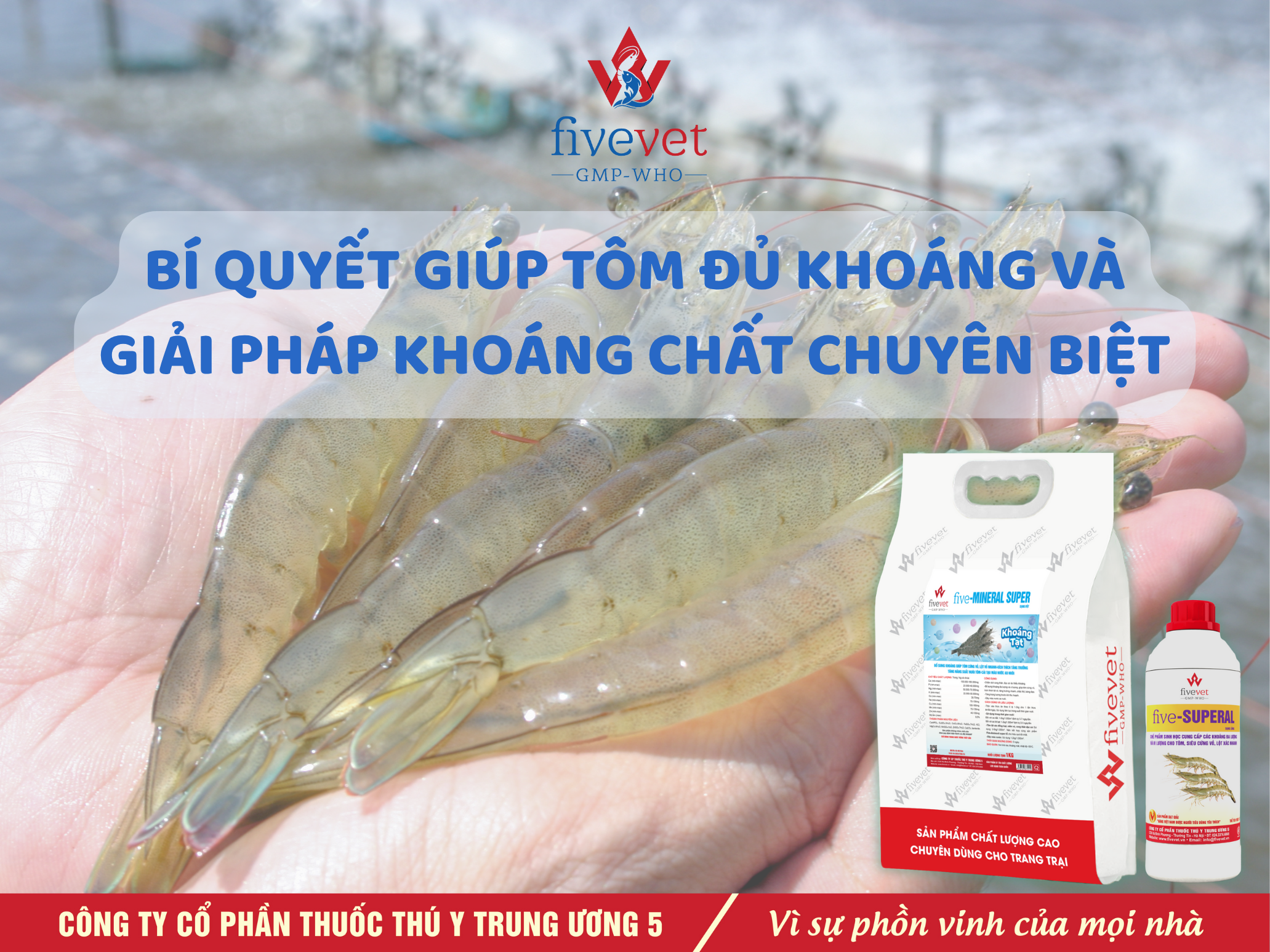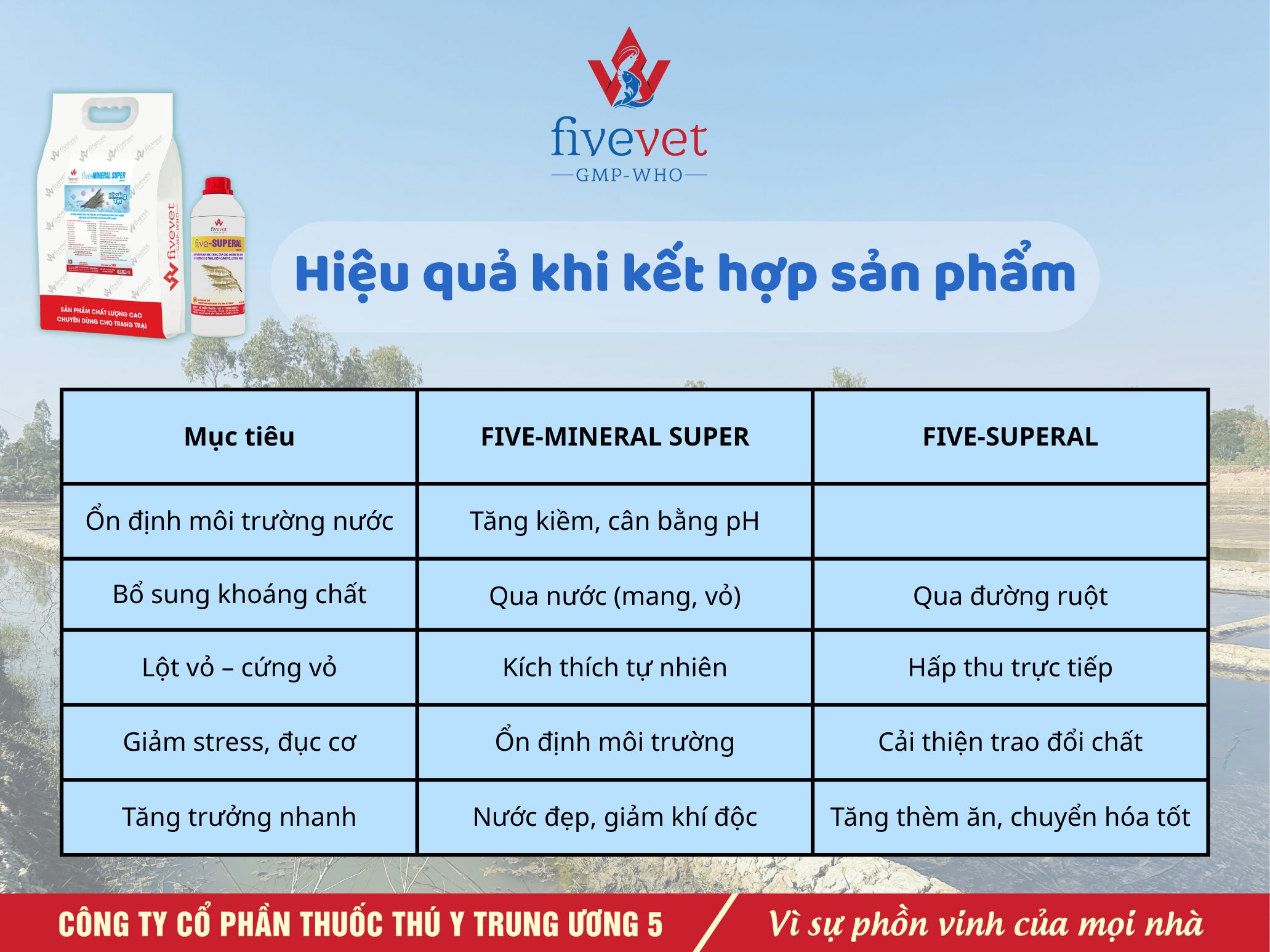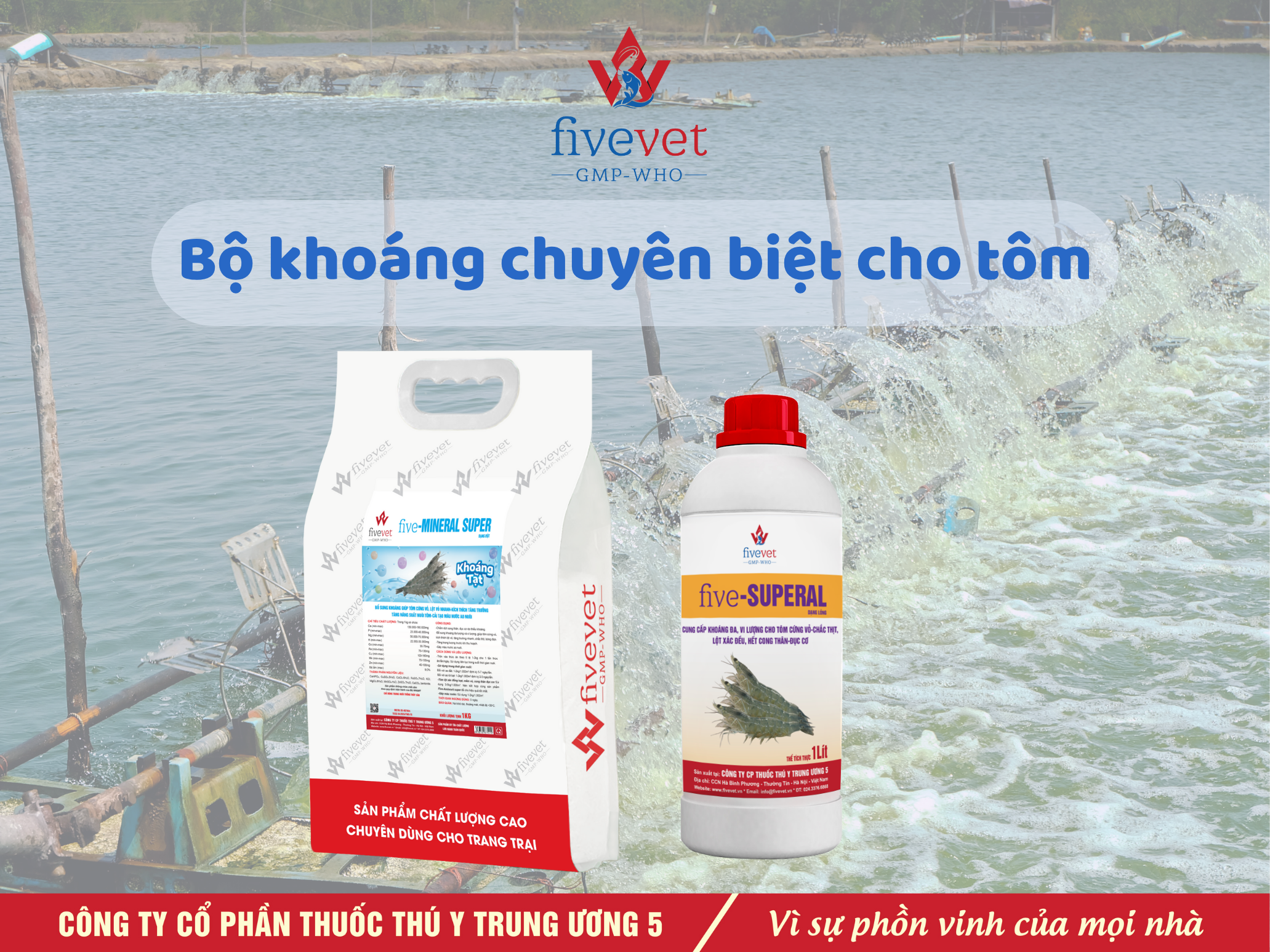 Bộ đôi khoáng chuyên biệt gồm Five-Mineral Super (dạng tạt) và Five-Superl (dạng trộn ăn) mang đến giải pháp kép giúp tôm khỏe mạnh, vỏ cứng bóng, tăng trưởng nhanh và môi trường ao luôn ổn định.