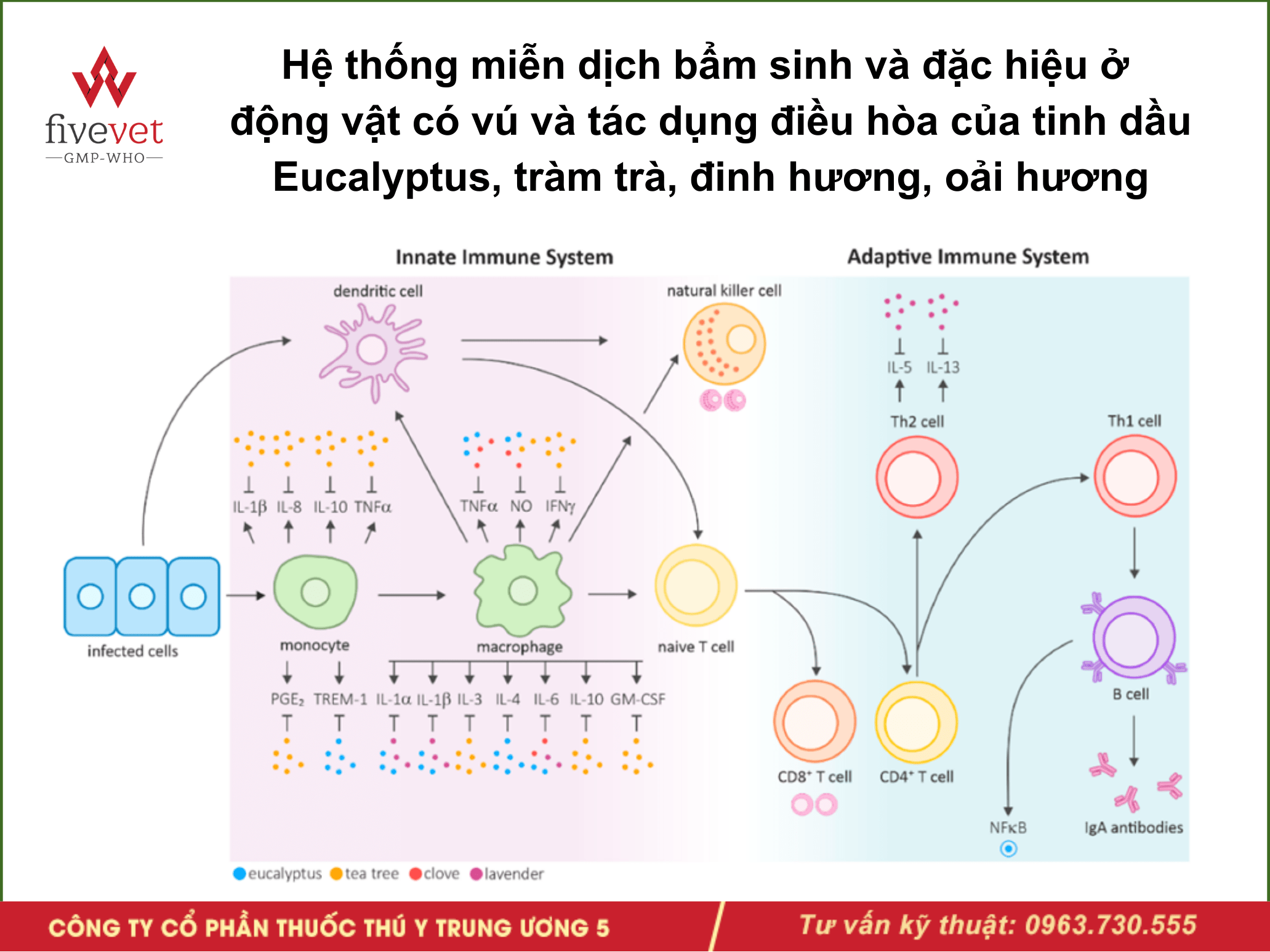 Hình 6. Hệ thống miễn dịch bẩm sinh và đặc hiệu ở động vật có vú và tác dụng điều hòa của tinh dầu Eucalyptus, tràm trà, đinh hương, oải hương