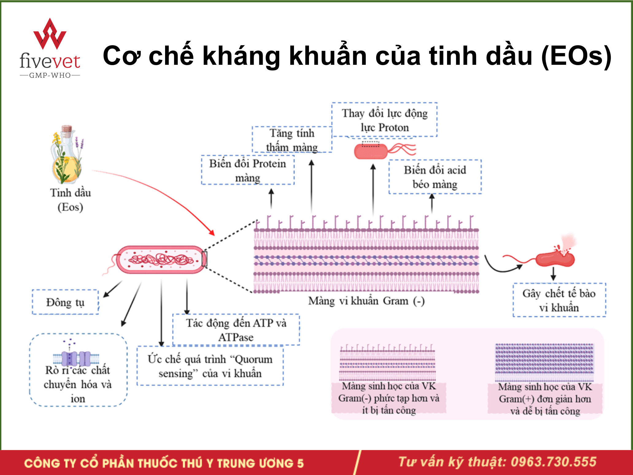 Tinh dầu phá vỡ cấu trúc màng tế bào vi khuẩn, làm rò rỉ protein, ATP, DNA khiến vi khuẩn mất năng lực sống. Một số tinh dầu còn ức chế vi khuẩn gây bệnh hô hấp ở bò và lợn như Pasteurella, Streptococcus, APP, H. parasuis,…