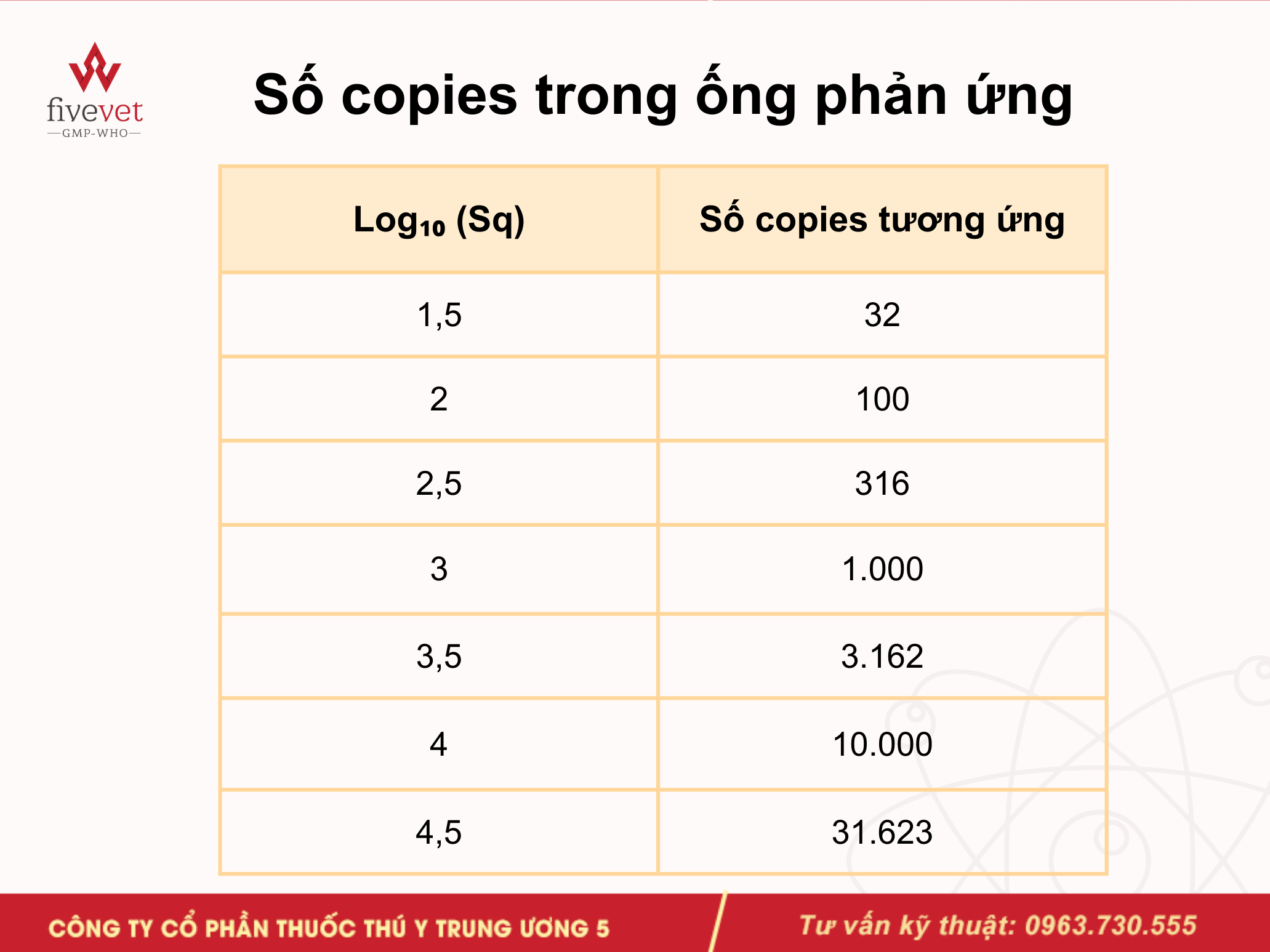 Do các mẫu chuẩn được pha loãng theo hệ số 10, nên trục X được biểu diễn dưới dạng log₁₀ số copies. Ví dụ: