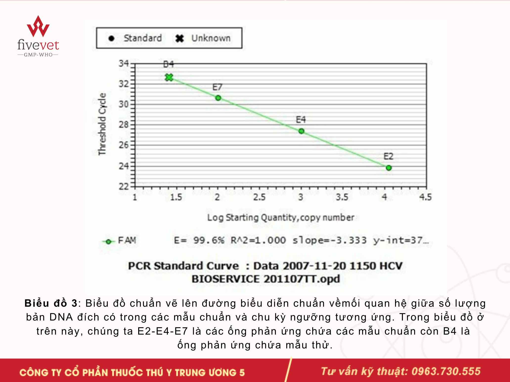 Biểu đồ 3: Biểu đồ chuẩn vẽ lên đường biểu diễn chuẩn về mối quan hệ giữa số lượng bản DNA đích có trong các mẫu chuẩn và chu kỳ ngưỡng tương ứng. Trong biểu đồ ở trên này, chúng ta E2-E4-E7 là các ống phản ứng chứa các mẫu chuẩn còn B4 là ống phản ứng chứa mẫu thử