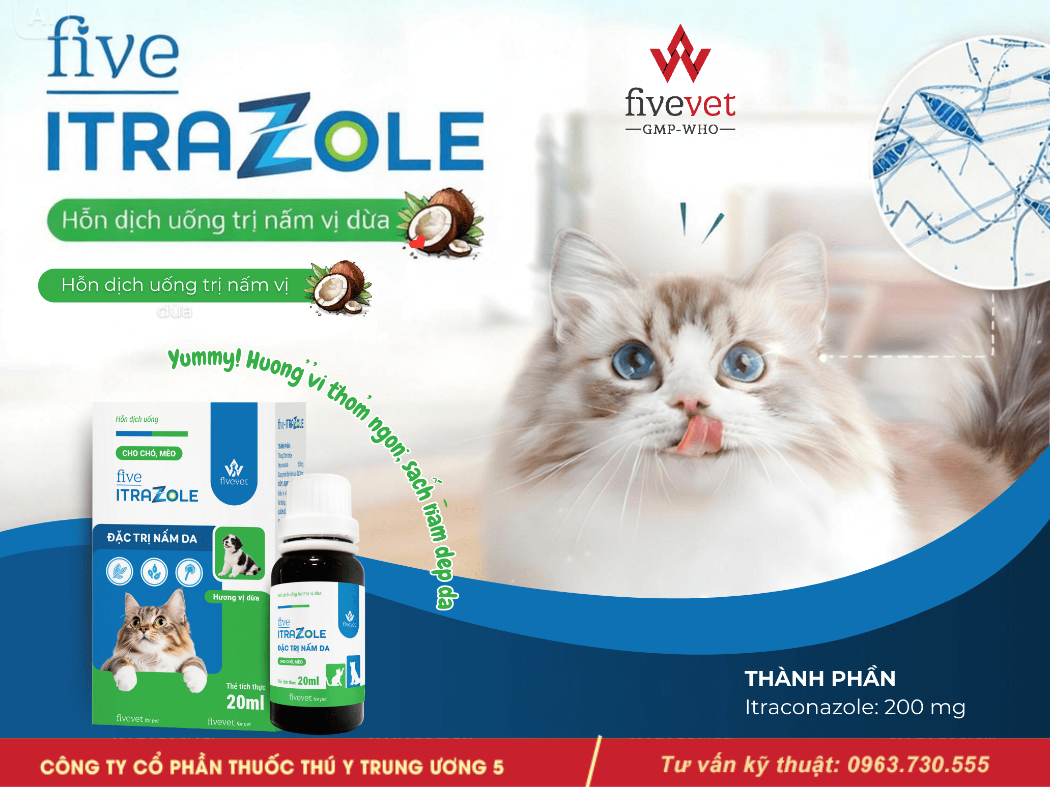 Five-Itrazole for Pet là sản phẩm chứa Itraconazole dạng dung dịch uống, được phát triển chuyên biệt cho chó và mèo, hỗ trợ điều trị nấm da và nhiễm nấm hệ thống.