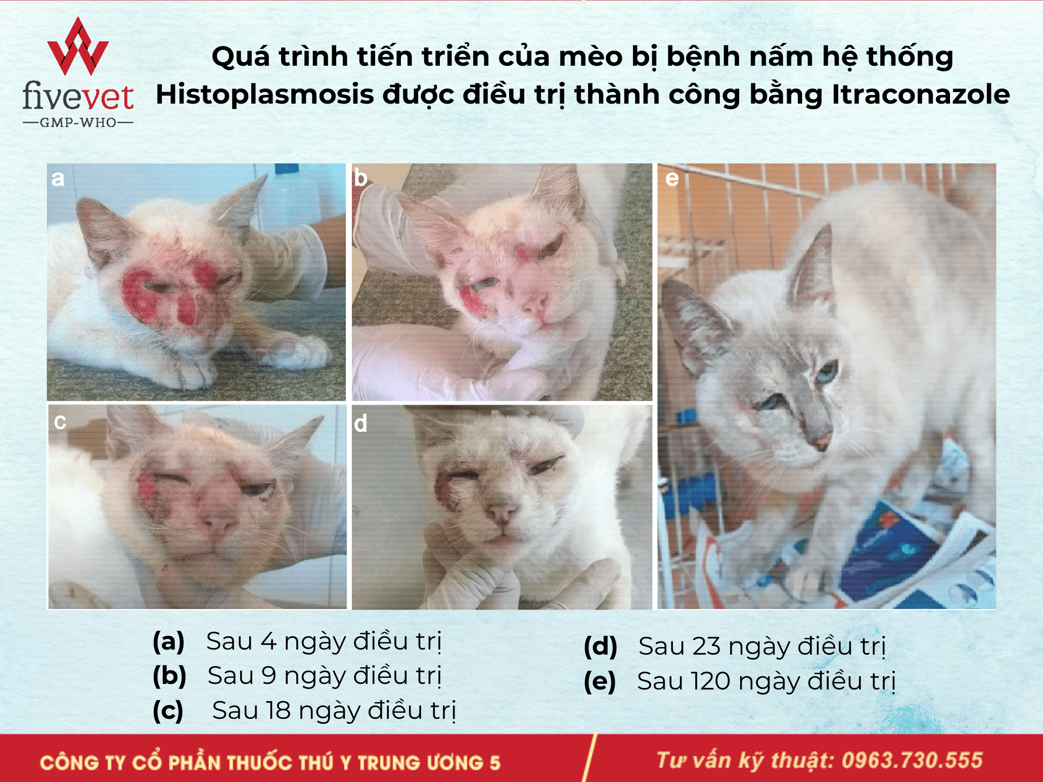Bên cạnh đó, một báo cáo ca bệnh lâm sàng tại Brazil ghi nhận một con mèo bị Histoplasmosis hệ thống được điều trị theo phác đồ Itraconazole đã cải thiện rõ rệt triệu chứng lâm sàng sau 30 ngày và khỏi hoàn toàn sau 120 ngày điều trị.