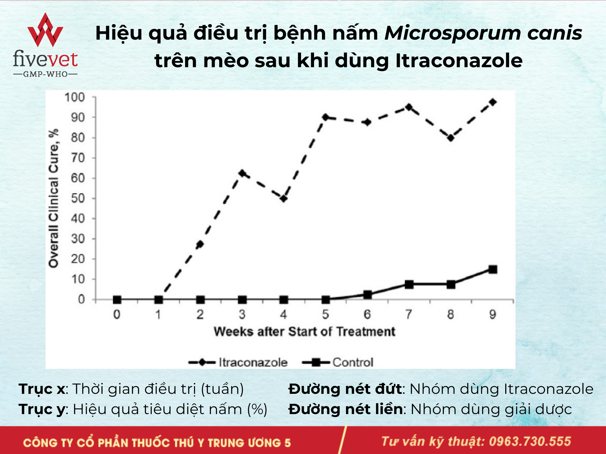 Kết quả cho thấy, sau 5 tuần điều trị, trên 90% mèo ở nhóm dùng Itraconazole khỏi bệnh và đến tuần thứ 9, 100% mèo được điều trị khỏi hoàn toàn.