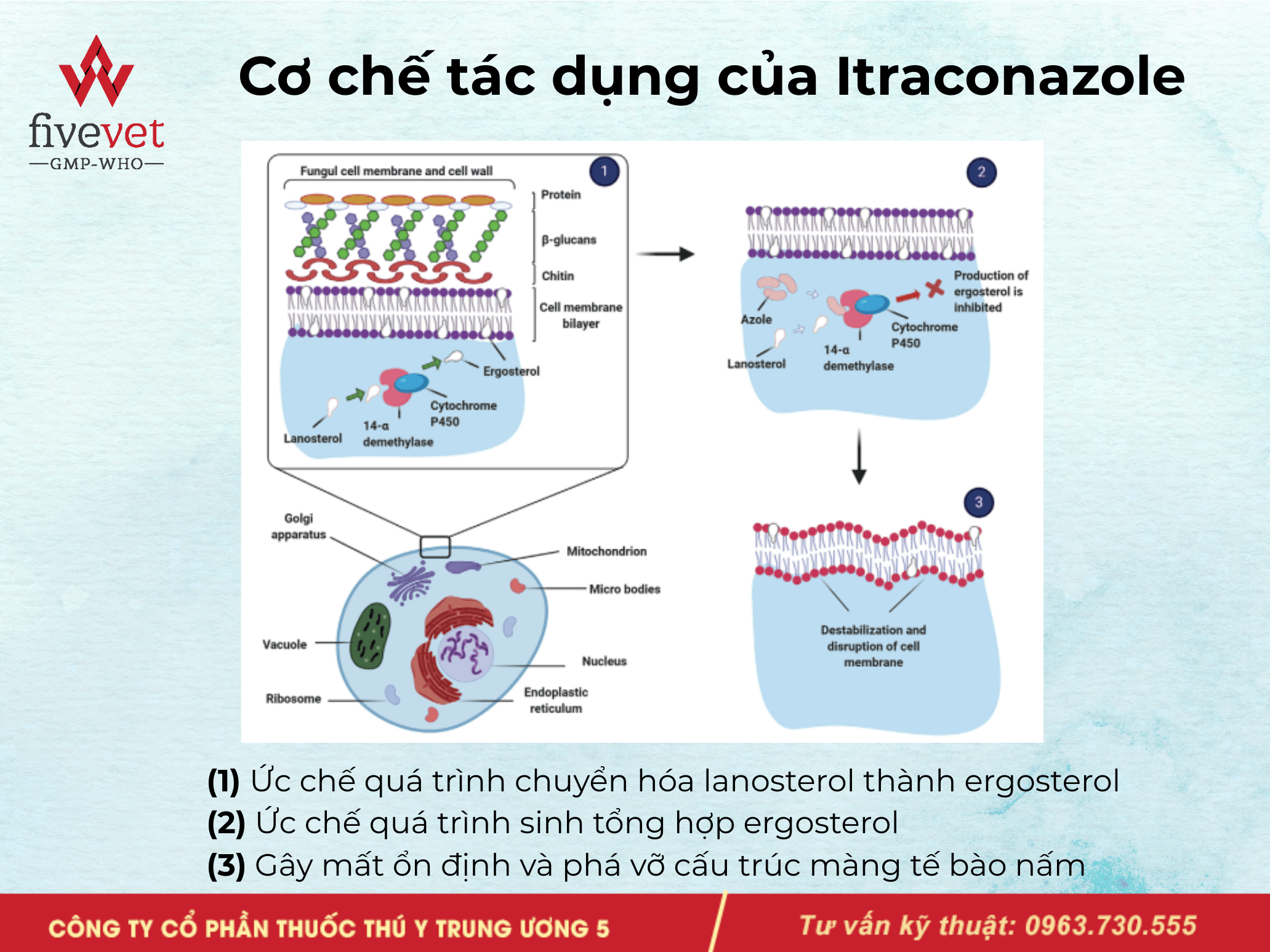 Itraconazole ức chế enzyme 14-α-demethylase (thuộc hệ cytochrome P450), làm gián đoạn quá trình tổng hợp ergosterol – sterol cấu tạo nên màng tế bào nấm. Sự phá vỡ cấu trúc và chức năng của màng tế bào nấm dẫn đến ức chế sự phát triển và gây chết tế bào nấm.