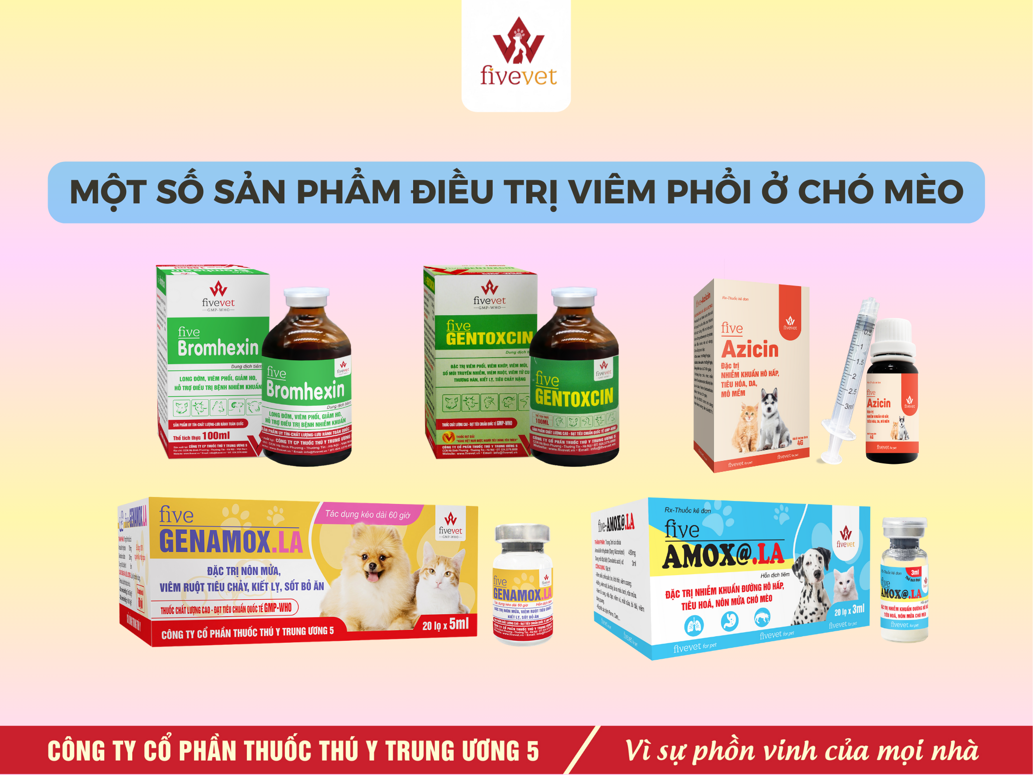 Five-Azicin. Trong một số trường hợp, bác sĩ có thể cân nhắc thuốc kháng viêm như Prednisolone để giảm viêm, giảm phù nề đường thở và cải thiện tình trạng khó thở, nhưng việc sử dụng sẽ phụ thuộc vào nguyên nhân nghi ngờ và đánh giá tình trạng từng con vật.