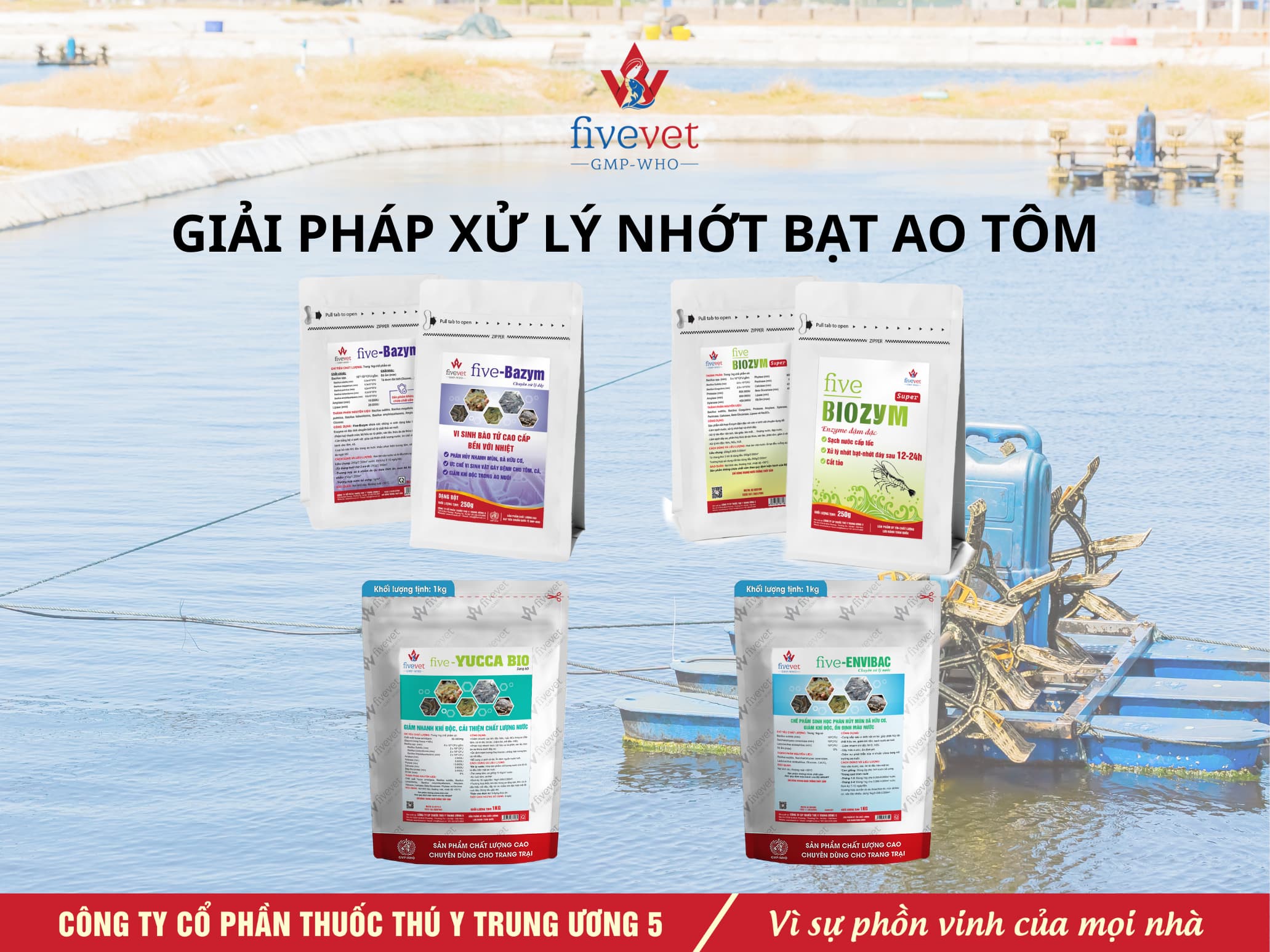 Trong quá trình xử lý, việc đảm bảo hàm lượng oxy hòa tan luôn ở mức cao là yếu tố then chốt giúp các lợi khuẩn hoạt động mạnh mẽ nhất. Nên vận hành tối đa hệ thống quạt nước và sục khí đáy để duy trì chỉ số oxy ổn định, đồng thời tạo ra dòng chảy mạnh giúp gom chất thải hiệu quả hơn. Giải pháp quan trọng nhất mang tính quyết định chính là sử dụng các dòng men vi sinh xử lý đáy như Five-Bazym, Five-Biozym super, Five-Envibac, kết hợp Five-Yucca Bio, Five-Yucca Bio Super có chứa các chủng vi khuẩn như Bacillus subtilis hay Bacillus licheniformis. Ưu tiên tạt vi sinh vào thời điểm nắng sáng từ 8 đến 10 giờ để lợi khuẩn có điều kiện phát triển tốt nhất, tiết ra các enzyme tự nhiên giúp bẻ gãy các liên kết bền vững của màng nhớt.