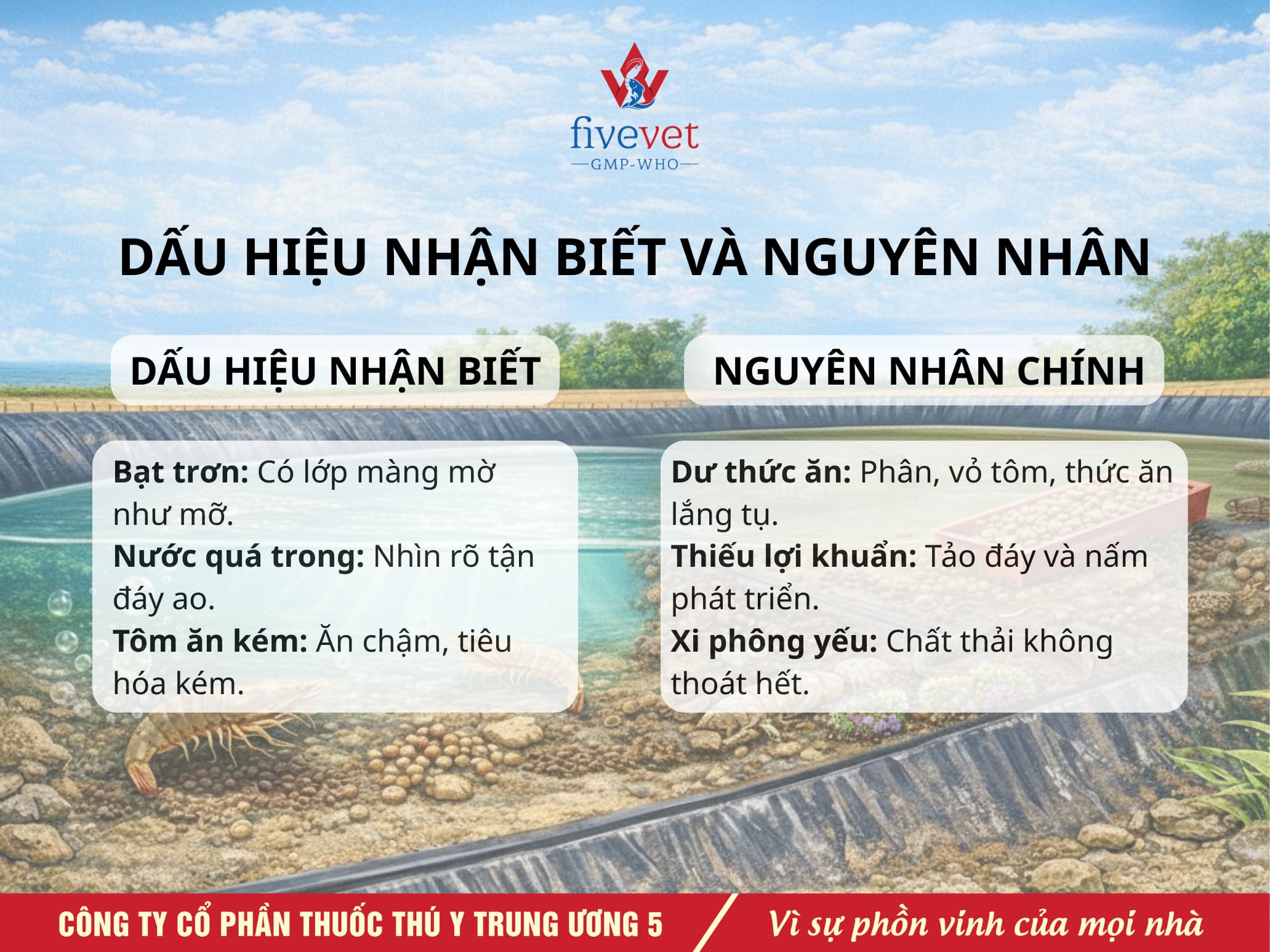 Trong nuôi tôm ao bạt hiện nay, nhớt bạt không chỉ đơn thuần là vấn đề vệ sinh môi trường ao nuôi mà còn là một dấu hiệu cảnh báo cho thấy hệ sinh thái đáy, môi trường ao nuôi đang bị suy thoái nghiêm trọng. Theo kinh nghiệm thực tế từ FiveAqua (Fivevet for Aqua), nếu không có biện pháp xử lý dứt điểm lớp màng nhầy này, đàn tôm sẽ rất dễ bị khí độc tấn công và đối mặt với các bệnh lý về đường tiêu hóa nguy hiểm. Bài viết dưới đây sẽ chia sẻ chi tiết về cách nhận biết, nguyên nhân gốc rễ cùng quy trình xử lý nhớt bạt theo hướng bền vững, giúp người nuôi tôm bảo vệ thành quả vụ nuôi một cách tốt nhất.