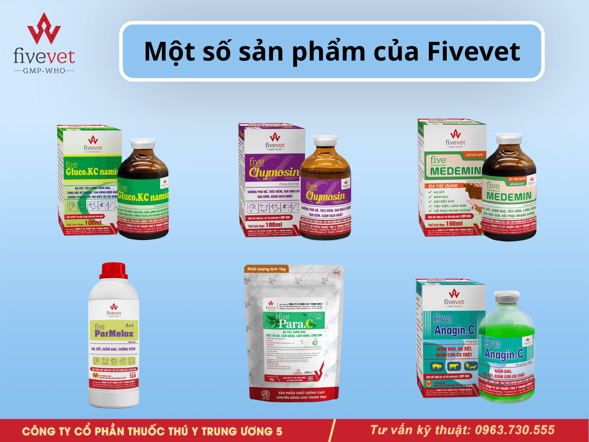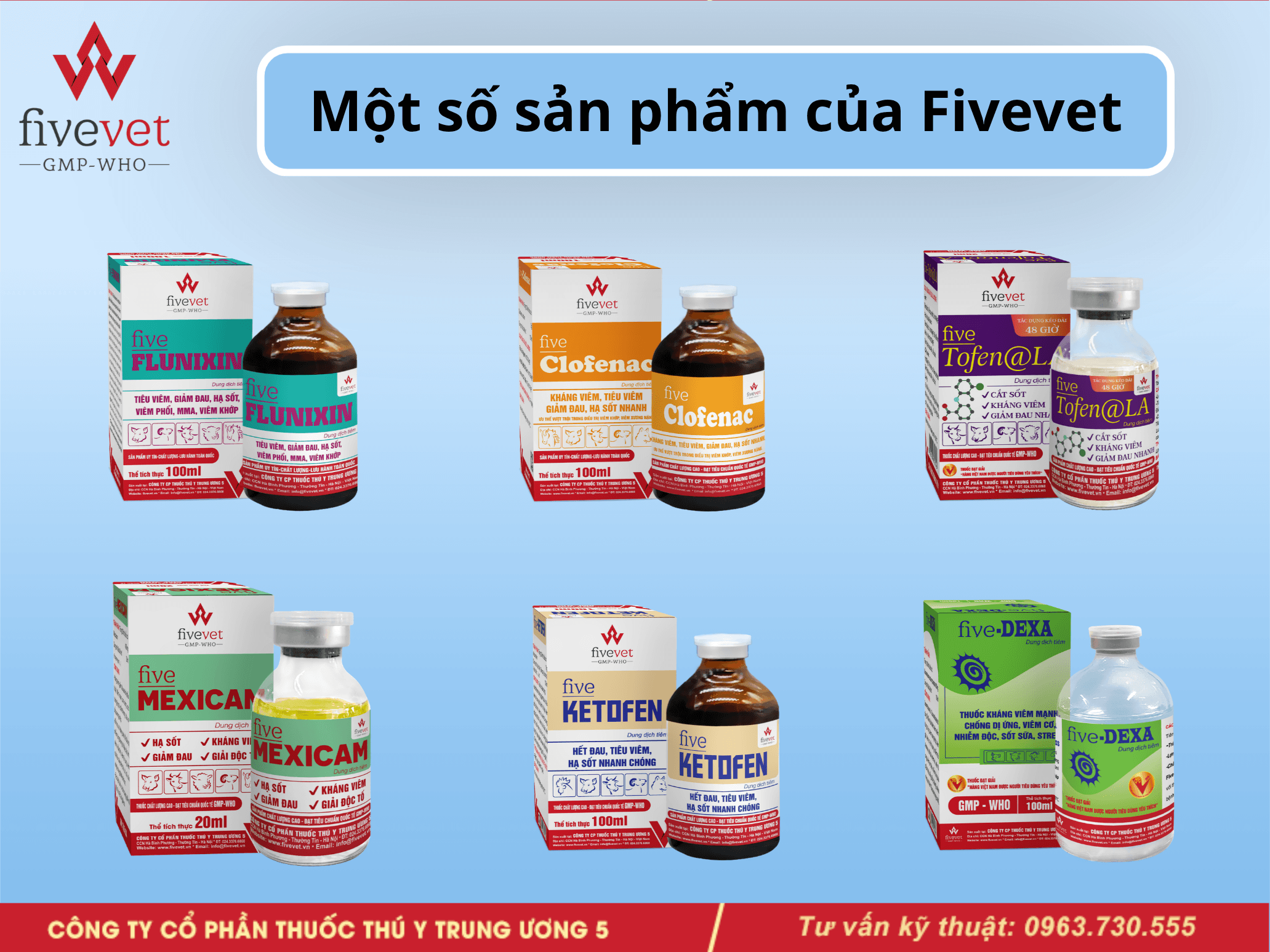 Để đáp ứng nhu cầu điều trị đa dạng trên từng loài vật nuôi, Fivevet cung cấp đầy đủ các dòng sản phẩm: Five-Parmelox, Five-Para.C, Five-Anagin.C, Five-Medemin, Five-Flunixin, Five-Clofenac, Five-Tofen@LA, Five-Gluco.KC namic, Five-Mexicam, Five-Ketofen, Five-Mexicam 0.5% for pet, Five-Ketofen for pet, Five-Dexa, Five-Chymosin,...
