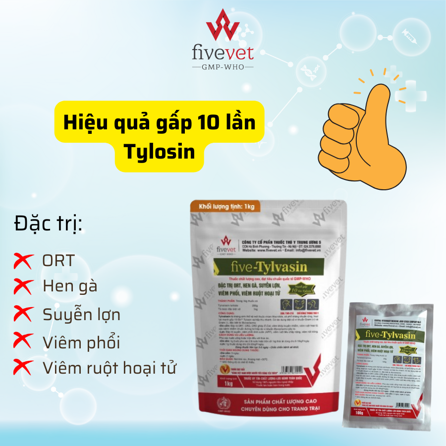 Dựa trên nền tảng nghiên cứu và phát triển của Tylvalosin, Five-Tylvasin đã được Công ty Cổ Phần Thuốc Thú Y Trung Ương 5 (Fivevet) giới thiệu và đã cho thấy hiệu quả tốt trong điều trị các bệnh do vi khuẩn gây ra như ORT, hen gà, suyễn lợn. Điều này sẽ giúp người chăn nuôi có thêm sự lựa chọn mới và hiệu quả để phòng và điều trị bệnh cho đàn vật nuôi của mình.