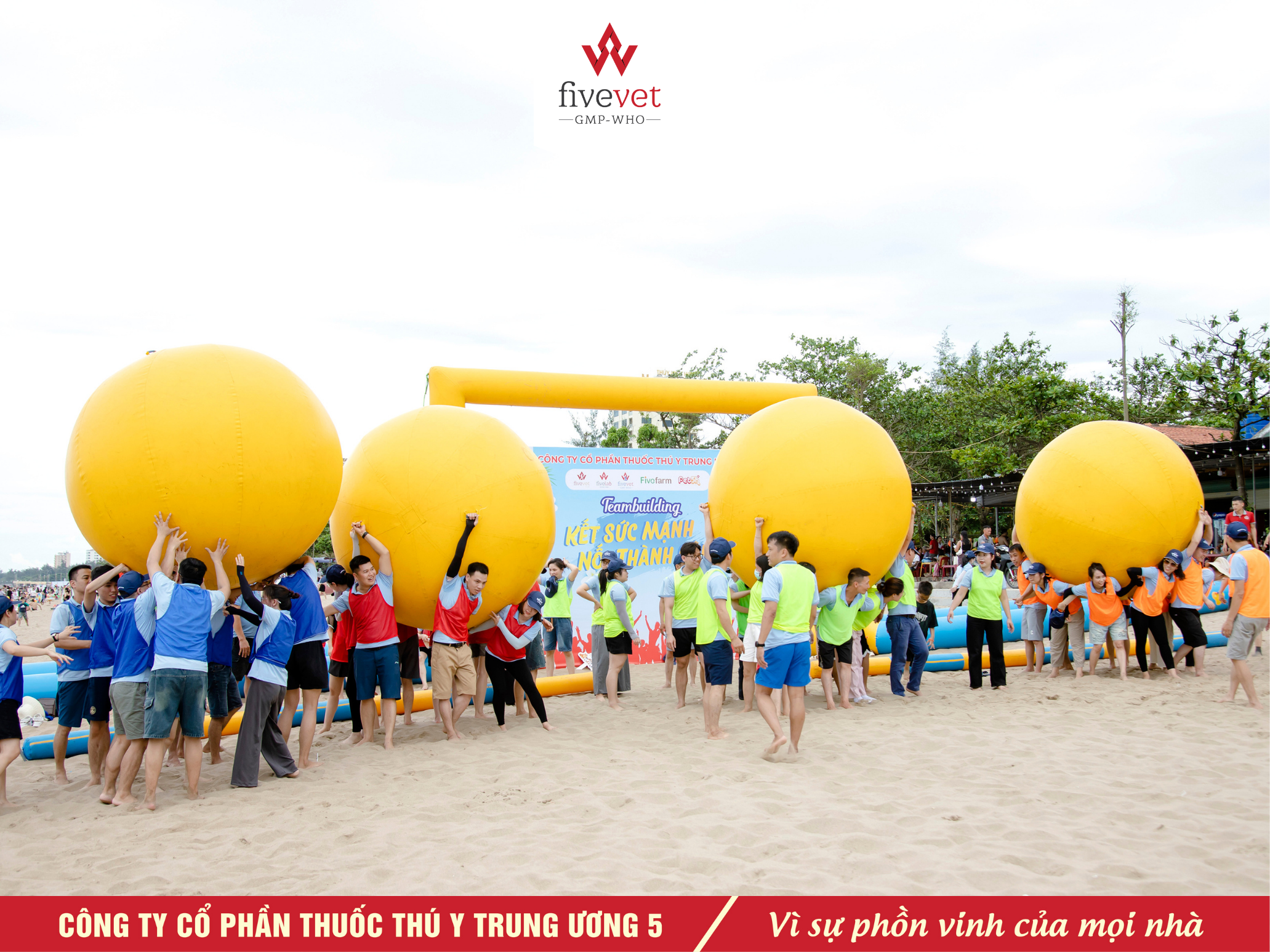 Buổi chiều, cả đoàn cùng cháy hết mình trong chương trình Teambuilding bãi biển “Kết sức mạnh, nối thành công”. Các đội chơi cùng nhau vượt qua các thử thách vận động hấp dẫn như về đích nhanh chóng với bóng khổng lồ, đoàn kết đua thuyền trên cạn cán đích ngay, vượt chướng ngại vật cùng với vòng lắc không chạm tay,... Những trận cười giòn tan, những tiếng reo hò cổ vũ không ngớt đã biến bãi biển thành một sân khấu lớn của sự gắn kết và nhiệt huyết. Hoạt động này không chỉ giúp giải tỏa căng thẳng mà còn tạo điều kiện để các thành viên hiểu nhau hơn, phối hợp ăn ý hơn trong công việc. Những tiếng hô vang Fivevet vọng khắp bãi biển Cửa Lò chiều ngày hôm ấy.