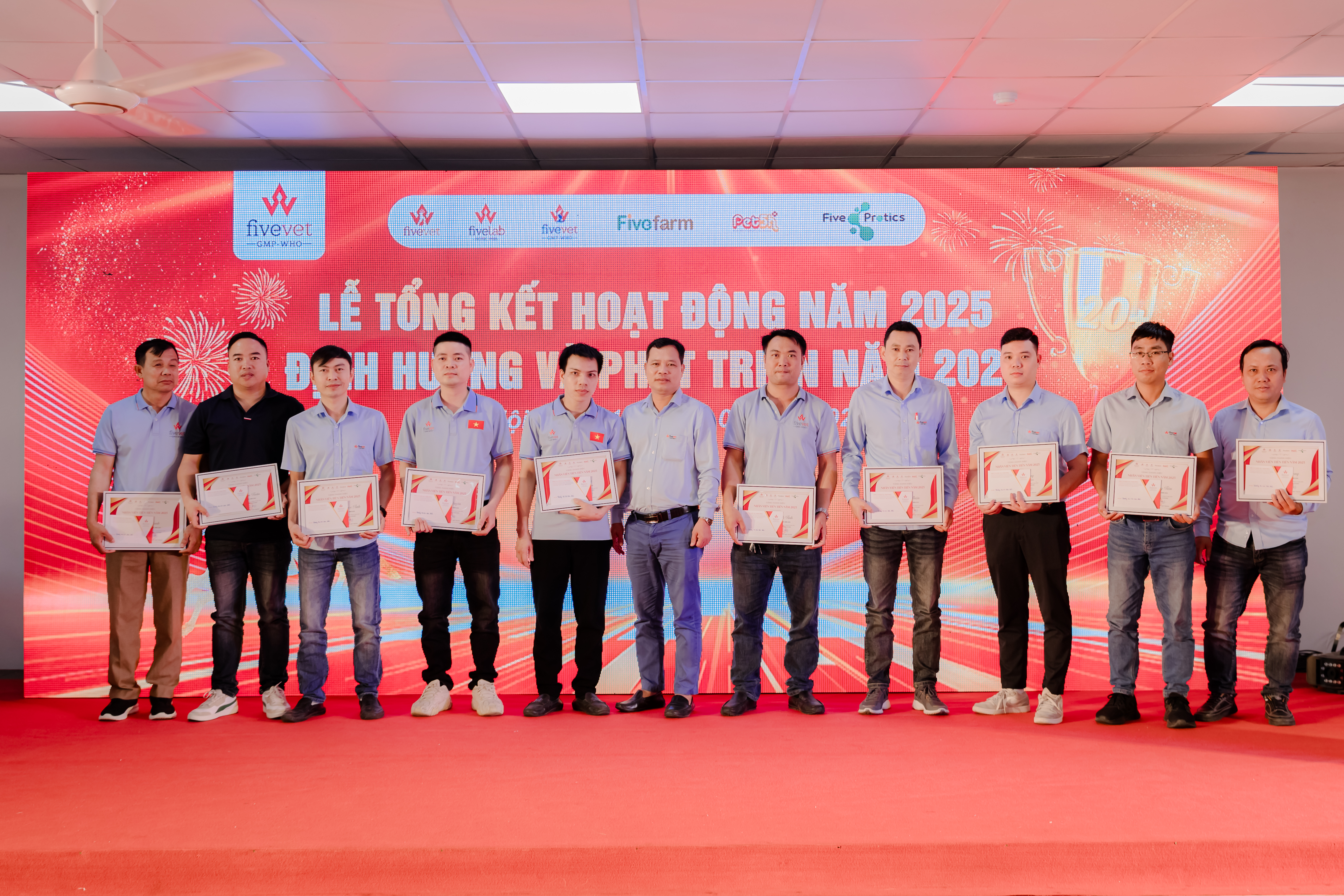 Trong hành trình phát triển của Fivevet, mỗi thành quả đạt được đều là kết tinh từ sự nỗ lực, cống hiến và tinh thần trách nhiệm của cả một tập thể. Chính vì vậy, phần khen thưởng tại chương trình mang ý nghĩa đặc biệt, không chỉ để vinh danh, mà để ghi nhận những giá trị thật đã được tạo dựng trong suốt một năm qua. Trong không khí trang trọng của chương trình, tập thể Fivevet vinh dự đón nhận Bằng khen của Bộ trưởng Bộ Nông nghiệp và Môi trường dành cho Công ty, cùng Bằng khen cho cá nhân Tổng Giám đốc vì những đóng góp xuất sắc cho sự phát triển của ngành nông nghiệp và môi trường giai đoạn 2024 - 2025. Đây không chỉ là niềm tự hào của Ban Lãnh đạo, mà là sự ghi nhận ở tầm cao đối với những nỗ lực chung của toàn thể cán bộ công nhân viên Fivevet – những con người đã âm thầm cống hiến, đổi mới và kiên định với con đường phát triển bền vững. Bên cạnh đó, chương trình cũng dành thời gian trang trọng để vinh danh các tập thể và cá nhân tiêu biểu, nhân viên tiên tiến và đội ngũ quản lý xuất sắc trong năm 2025. Mỗi danh hiệu được trao đi là sự khẳng định cho tinh thần tận tâm, ý chí cầu tiến của đội ngũ nhân lực. Sự ghi nhận hôm nay không chỉ khép lại một năm nhiều nỗ lực, mà còn mở ra nguồn động lực để mỗi cá nhân tiếp tục cống hiến, cùng Fivevet bước tiếp trên hành trình phát triển bền vững phía trước.