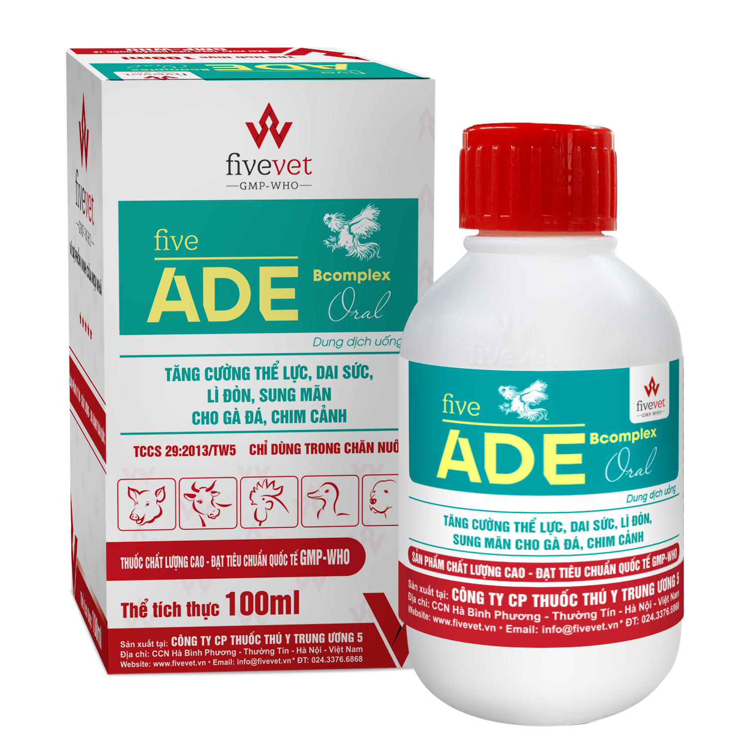 Five-ADE.BCOMPLEX Oral cung cấp đầy đủ và cân đối các thành phần dinh dưỡng thiết yếu cho gà, vịt, ngan, chim cút và gia súc giúp: