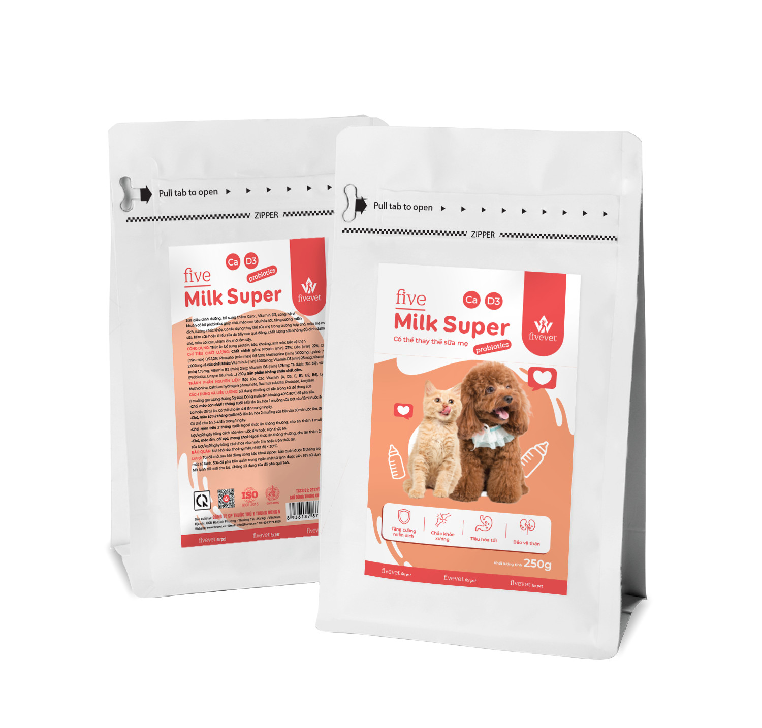 Five-Milk super (for pet) là sản phẩm sữa giàu dinh dưỡng, bổ sung thêm Canxi, Vitamin D3, cùng hệ vi khuẩn có lợi probiotics giúp chó, mèo con tiêu hóa tốt, tăng cường miễn dịch, xương chắc khỏe. Có tác dụng thay thế sữa mẹ trong trường hợp chó, mèo mẹ mất sữa, kém sữa hoặc thiếu sữa do bầy con quá đông, chất lượng sữa không đủ dinh dưỡng; chó, mèo còi cọc, chậm lớn, mới ốm dậy.